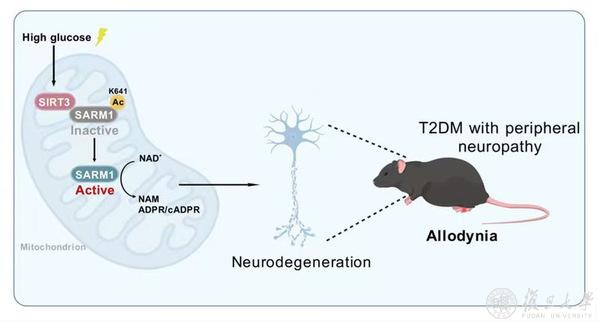 糖尿病周围神经病变的核心病理特征是SARM1介导的轴突变性,但在高血糖微环境下其被精准激活背后的翻译后修饰机制尚不明晰。 复旦大学生命科学学院余巍课题组首次揭示了高血糖环境下,线粒体去乙酰化酶SIRT3通过去除SARM1 K641位点的乙酰化修饰,从而激活其NADase活性,加剧神经变性的新机制,为DPN的干预提供了潜在的分子靶点。其研究成果以“Hyperglycemia Promotes SIRT3-Mediated Deacetylation of SARM1 to Exacerbate Diabetic Peripheral Neuropathy in Mice”为题,于1月9日发表于Proceedings of the National Academy of Sciences of the United States of America。