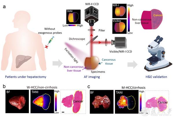 在外科手术中实现术中实时、准确判断肿瘤边界至关重要,但现有依赖医生肉眼判断或术中病理检查的方法在速度、覆盖范围和实时性方面均存在显著局限。近日,复旦大学化学系张凡教授、药学院何海生青年副研究员团队联合复旦大学附属华山医院副院长钦伦秀教授/朱文伟主任医师团队,成功研发了一种无需注射任何造影剂的术中实时肿瘤边界可视化新技术,即组织自发荧光近红外成像技术(Tissue Autofluorescence NIR-II Imaging,TANI)。相关研究成果以“Label-free tissue NIR-II autofluorescence imaging for visualization of human liver malignancy”为题,于1月20日发表于Nature Biomedical Engineering。