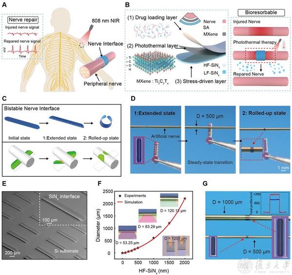 该器件基于应力梯度驱动的超薄SiNx双层结构,在触发后可由平面状态自发转变为三维卷曲结构,从而对不同直径的外周神经实现温和而稳定的包覆。在功能集成方面,该神经接口引入MXene光热层与药物负载模块,构建了无线近红外触发的光热治疗与药物释放相结合的多模态治疗体系,实现了对神经修复过程的时空精准调控。该工作在结构设计、力学机制及治疗策略层面实现了有机融合,为下一代微创、智能神经接口的发展奠定了重要基础。