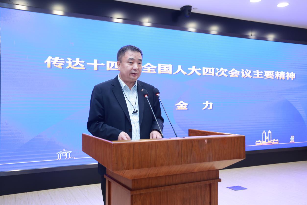 金力传达十四届全国人大四次会议召开情况和习近平总书记的重要讲话精神,介绍报告大会通过的各项报告和法律案情况、上海代表团的审议情况和提出议案建议情况等。他表示这次大会充分彰显“两个确立”的决定性意义,为凝心聚力推动“十五五”开好局起好步、广泛汇聚经济社会高质量发展的良策实招奠定了扎实基础。围绕习近平总书记在两会期间的重要讲话精神和上海代表团相关讨论审议情况,金力结合学校的改革实践提出要优化调整高校教育教学目标和课程设置,促进学科交叉融合,强调从学科到领域、从专业到项目、从院系到平台和坚决投资于人四个方面入手,坚定推进高校改革,引领支撑新质生产力的蓬勃发展。