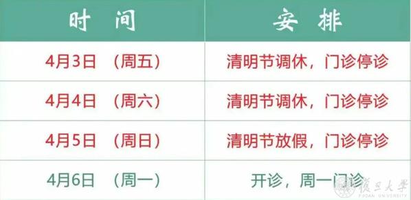 4月3日(周五)至5日(周日)共3天,放假,无门诊,4月6日(周一)上班,正常门诊。
