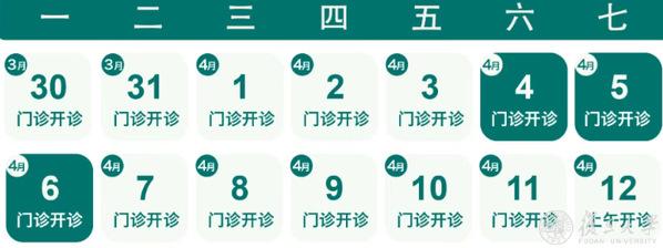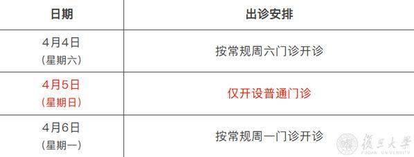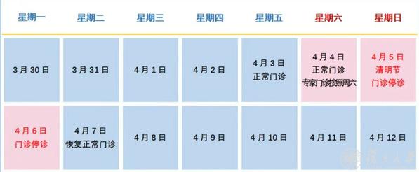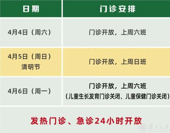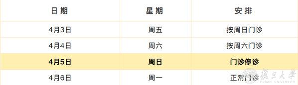 4月4日(周六)全天门诊,开诊科室同周六;4月5日(周日)门诊暂停;4月6日(周一)门诊暂停;以上时段,急诊照常,发热门诊24小时开放。