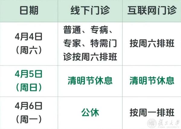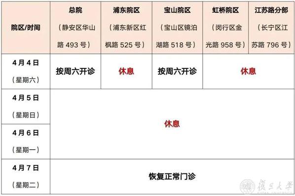 总院及闵行门诊安排一致,浦东线下门诊4月4日休息,其余安排同总院;普通、专病、专家、特约、特需、MDT门诊以当日出诊情况为准;急诊、发热门诊24小时开放;互联网门诊以当日排班为准;节日期间部分门诊停诊,请您提前预约;4月4日~4月6日互联网医院暂停药品自提和物流配送,4月7日起恢复自提与配送。