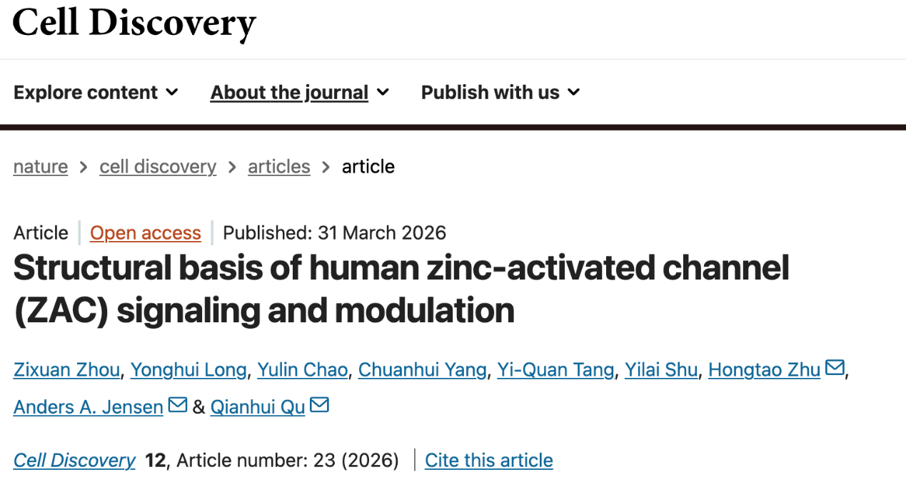 2026年3月31日,复旦大学生物医学研究院/附属眼耳鼻喉科医院屈前辉课题组与哥本哈根大学Anders A. Jensen教授、中科院物理所朱洪涛研究员合作,在Cell Discovery上发表了题为“Structural basis of human zinc-activated channel (ZAC) signaling and modulation”的研究论文,首次系统解析了人源ZAC在静息、锌离子激活及小分子抑制状态下的高分辨率结构,为理解这一非典型CLR受体的功能奠定了重要基础。
