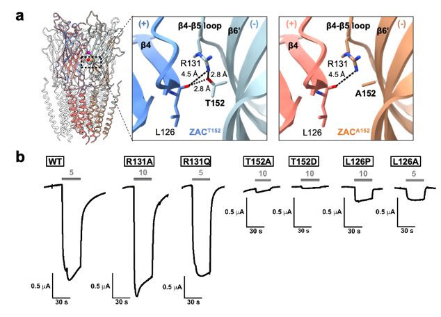 图3. ZACA152变异体功能减弱的分子基础及离子通透路径。a,野生型ZAC(T152)与变异体ZACA152在关键相互作用网络(Thr152/Leu126)上的结构差异。b,T152支点网络突变体的电生理结果。