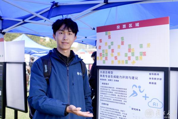 在体育教学部运动训练专业24级本科生王鼎盛制作的海报上有一张图表,横轴是不同的大语言模型,纵轴是它们在体育专业知识领域的测评得分。