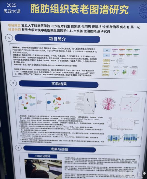 生命机理探索同样精彩。2024级临床医学(五年制)本科生周凯鹏团队带来《脂肪组织衰老图谱研究》,在导师指导下整合测序数据,“脂肪衰老和糖尿病、内分泌病密切相关,我们希望画出一张清晰‘地图’,给后续研究打基础。”周凯鹏说。