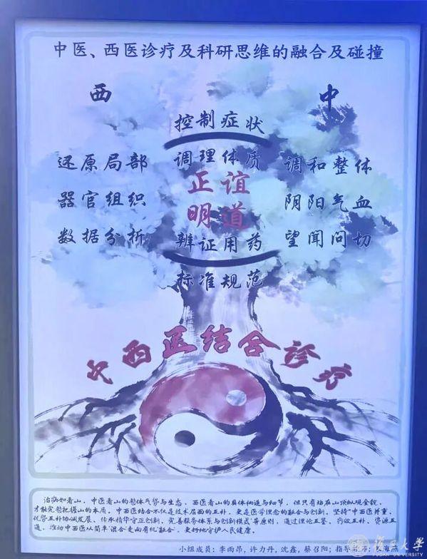 中西医融合展台则别具韵味。水墨风海报以太极、树枝为意象,象征中西医根系相连、互补共生。“一开始我对中医有偏见,真正进门诊、看病例才明白:中西相映才更完整。”2024级临床医学(八年制)本科生李雨昂指着课题《中医、西医诊疗及科研思维的融合及碰撞》的海报说,“药学院微生物与生化药学系的朱海燕老师带我们深入中西医门诊、走进中药博物馆,在真实诊疗场景中感受不同学科思维的碰撞与交融,正是这种跨学科、跨专业的指导与协作,让大家在跨界视野中拓宽科研思路。”展板前,不少同学驻足观看,驻足思考。