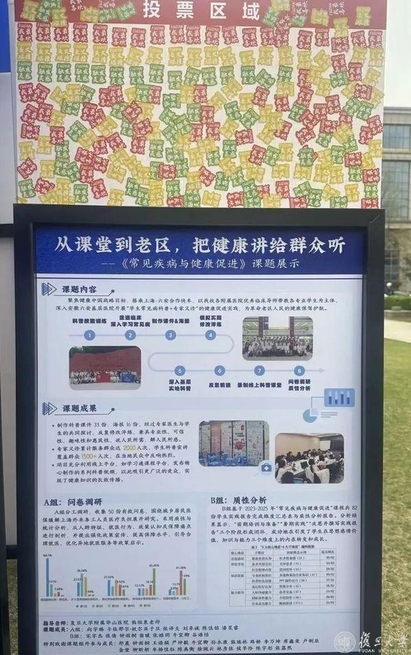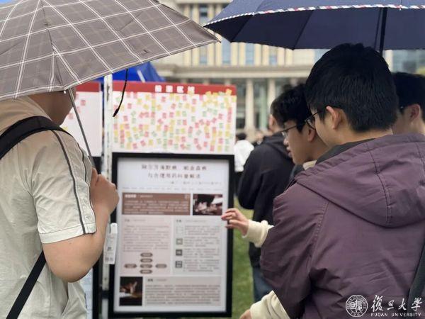 3月31日下午,细雨蒙蒙的光华楼前草坪人潮涌动。2026年春季学期“强国之路”思政大课“悟”阶段2024级本科生课题作业展示嘉年华正式启幕。735名复旦医学生携140余项践行课题亮相,把专业探索、医学人文、基层实践、前沿技术搬到光草,以海报为媒、以探究为笔、以创新为翼,共同打造了一场“青春学术市集”。