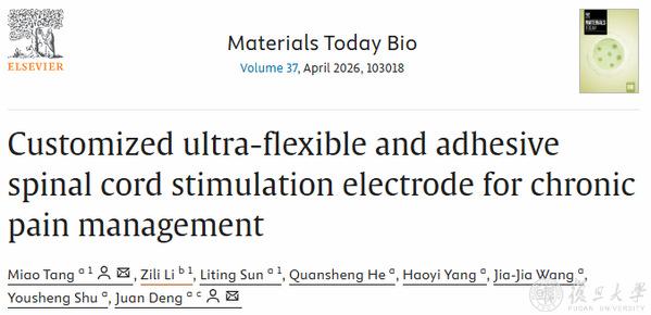 2026年3月12日,复旦大学脑科学转化研究院邓娟、唐淼团队在《今日生物材料》(Materials Today Bio)发表题为“Customized ultra flexible and adhesive spinal cord stimulation electrode for chronic pain management”的论文。神经界面的长期稳定性与生物相容性是制约神经调控技术临床转化的关键瓶颈。脊髓电刺激(SCS)在临床中常面临电极移位、力学失配及疗效衰减等问题。为解决这一难题,团队研发了定制化超柔性粘附型脊髓刺激电极,为慢性疼痛提供长效、稳定的神经调控方案。