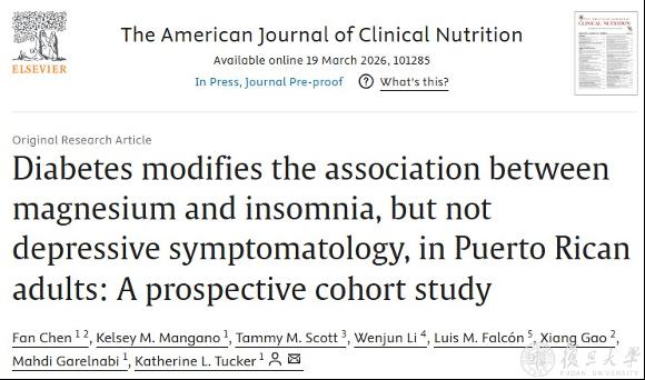 2026年3月19日,复旦大学营养研究院/公共卫生学院高翔团队联合马萨诸塞大学洛厄尔分校、塔夫茨大学团队在 《美国临床营养学杂志》(The American Journal of Clinical Nutrition)发表了题为 “Diabetes modifies the association between magnesium and insomnia, but not depressive symptomatology, in Puerto Rican adults: A prospective cohort study”的研究。研究发现镁摄入与失眠的关联仅在非糖尿病者中显著。既有证据表明糖尿病相关的胰岛素抵抗可增加肾脏镁流失,且降糖药(尤其是二甲双胍)可影响镁代谢并与低镁血症相关,这些机制可能解释部分镁与糖尿病的交互效应。因此,在制定有关镁的营养干预与公共卫生建议时,应将慢性病背景纳入考量。