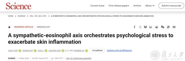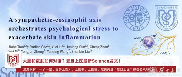 2026年3月20日,复旦大学脑科学研究院/脑功能与脑疾病全国重点实验室、脑科学前沿科学中心柳申滨团队在《科学》(Science)杂志上发表题为《交感神经-嗜酸性粒细胞轴介导心理应激加剧皮肤炎症》( “A sympathetic-eosinophil axis orchestrates psychological stress to exacerbate skin inflammation” )的研究论文,系统揭示了大脑应激信号经由特定轨道的皮肤交感神经募集并激活嗜酸性粒细胞,进而触发炎症级联放大效应的神经免疫学基础。