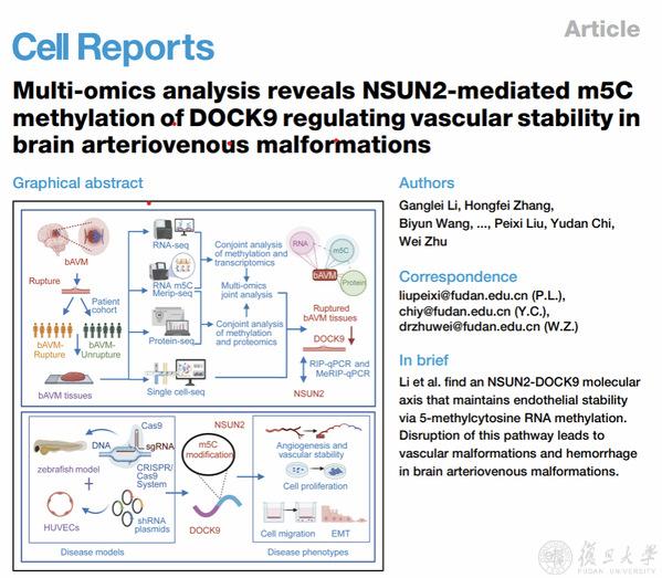 2026年3月22日,复旦大学附属华山医院朱巍团队、复旦大学脑科学转化研究院/复旦大学附属华山医院迟喻丹团队合作在《细胞报告》(Cell Reports)在线发表题为“Multi-omics analysis reveals NSUN2-mediated m5C methylation of DOCK9 regulating vascular stability in brain arteriovenous malformations”的研究论文。该研究从表观转录组学这一全新视角出发,聚焦脑动静脉畸形血管稳定性的核心问题,揭示了血管由“稳定”走向“破裂”的关键分子机制,并锁定NSUN2-DOCK9这一重要调控轴,为精准干预提供了新思路。