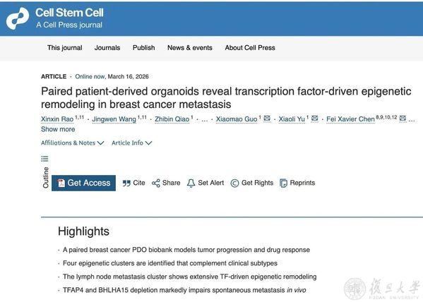 2026年3月16日,复旦大学附属肿瘤医院郭小毛、俞晓立、陈飞、沈敏洪团队合作在《细胞-干细胞》(Cell Stem Cell)发表题为“Paired patient-derived organoids reveal transcription factor-driven epigenetic remodeling in breast cancer metastasis”的研究论文。研究团队通过建立乳腺癌患者来源类器官(PDOs)生物库,并结合多组学分析,系统描绘了乳腺癌进展过程中的表观遗传变化图谱,识别出四种不同的乳腺癌表观遗传状态,并进一步发现驱动淋巴结转移的关键转录因子网络。