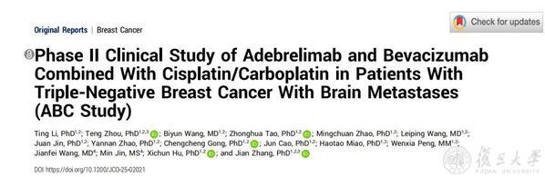 2026年3月4日,复旦大学附属肿瘤医院乳腺肿瘤中心张剑、胡夕春领衔的研究团队,在《临床肿瘤学杂志》(Journal of Clinical Oncology, JCO)发表题为“Phase II Clinical Study of Adebrelimab and Bevacizumab Combined With Cisplatin/Carboplatin in Patients With Triple-Negative Breast Cancer With Brain Metastases (ABC Study)”的论文。研究构建并验证了一套名为“ABC”的三药联合治疗新方案,显著突破了晚期三阴性乳腺癌(TNBC)脑转移的治疗瓶颈。临床试验数据显示,接受该方案治疗的患者颅内客观缓解率高达77.1%,中位总生存期(OS)延长至21.1个月,较历史数据接近翻倍,且整体安全性良好,为全球三阴性乳腺癌脑转移患者提供了极具价值的“中国解法”。