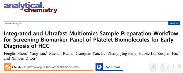2026年3月10日,复旦大学上海医学院公共技术平台/生物医学研究院质谱平台主任周新文、工程师沈枫林、刘洋与广西医科大学第二附属医院检验科胡作建、阮学莲合作,在《分析化学》(Analytical Chemistry)上发表题为“Integrated and Ultrafast Multiomics Sample Preparation Workflow for Screening Biomarker Panel of Platelet Biomolecules for Early Diagnosis of HCC”的研究论文。该研究开发了一种整合的快速多组学样本制备方法(IAU-MOSP),可在6小时内完成蛋白质组、代谢组和脂质组的同步分析,为血小板这一新型液体活检材料的深度挖掘提供了高效技术方案。