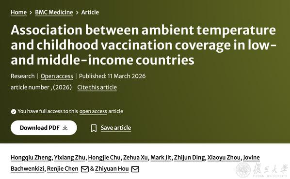 2026年3月11日,复旦大学公共卫生学院侯志远、陈仁杰课题组在《BMC医学》(BMC Medicine)发表题为“Association between ambient temperature and childhood vaccination coverage in low- and middle-income countries”的论文。研究基于2010-2019年间50个中低收入国家的代表性样本,揭示了气候变暖与儿童疫苗接种之间的负向关联,明确了不同地区和人群气候敏感性的差异。
