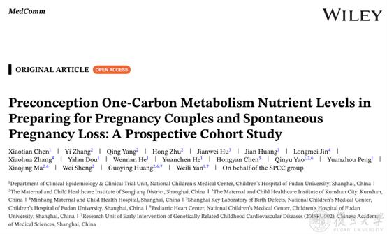 2026年3月15日,复旦大学附属儿科医院黄国英、严卫丽教授团队在《医疗通讯》(MedComm)发表题为“Preconception One-Carbon Metabolism Nutrient Levels in Preparing for Pregnancy Couples and Spontaneous Pregnancy Loss: A Prospective Cohort Study”的研究论文。该研究首次在大规模前瞻性队列中证实父母双方孕前红细胞叶酸浓度与SPL风险呈独立的负向关联,父亲孕前叶酸状态的作用尤为重要。这一发现突破了既往以母亲为中心的备孕期营养干预思路,为提倡“夫妇共补”的策略提供科学依据。