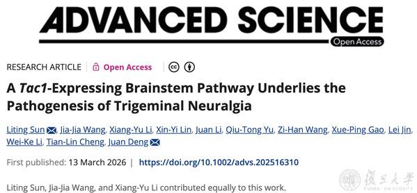 2026年3月13日,复旦大学脑科学转化研究院邓娟、孙立婷团队在《先进科学》(Advanced Science)发表题为“A Tac1-Expressing Brainstem Pathway Underlies the Pathogenesis of Trigeminal Neuralgia”的研究论文,团队利用三叉神经痛小鼠模型(Chronic constriction injury of the infraorbital nerve, CION),结合单细胞测序、光遗传学、化学遗传学等前沿技术,通过对脑干环路的全面解析,精准锁定了驱动这一剧痛的关键分子—Tac1,绘制出了一幅清晰的三叉神经痛上行传递地图,更从分子层面解析了痛觉过敏的本质。