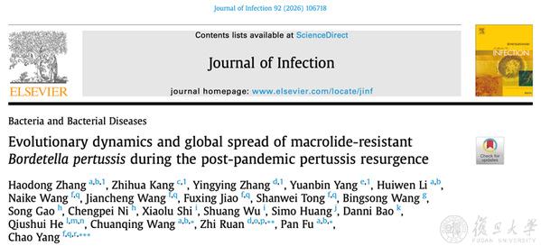 2026年3月7日,复旦大学附属儿科医院王传清、付盼团队联合上海交通大学公共卫生学院杨超团队以及浙江大学医学院附属邵逸夫医院阮陟团队,在《感染杂志》(Journal of Infection)发表题为“Evolutionary dynamics and global spread of macrolide-resistant Bordetella pertussis during the post-pandemic pertussis resurgence”的研究论文。在前期研究基础上,此研究全面整合来自全球35个国家的8117株百日咳鲍特菌基因组数据,构建了迄今为止全球最新最全的百日咳鲍特菌基因组数据库,系统解析后疫情时期全球百日咳菌株的进化轨迹,揭示百日咳在不同国家间的共性进化趋势与区域特异性差异,并进一步阐明MR-MT28亚型的传播及分子进化特征。