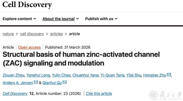 2026年3月31日,复旦大学生物医学研究院/附属眼耳鼻喉科医院屈前辉课题组与哥本哈根大学Anders A. Jensen教授、中科院物理所朱洪涛研究员合作,在《细胞发现》(Cell Discovery)上发表了题为“Structural basis of human zinc-activated channel (ZAC) signaling and modulation”的研究论文,首次系统解析了人源锌激活通道(ZAC)在静息、锌离子激活及小分子抑制状态下的高分辨率结构,为理解ZAC这一非典型受体提供了关键结构基础,揭示了其独特的激活与抑制机制,也为未来针对ZAC的相关药物研发提供了重要的理论依据和结构蓝图。