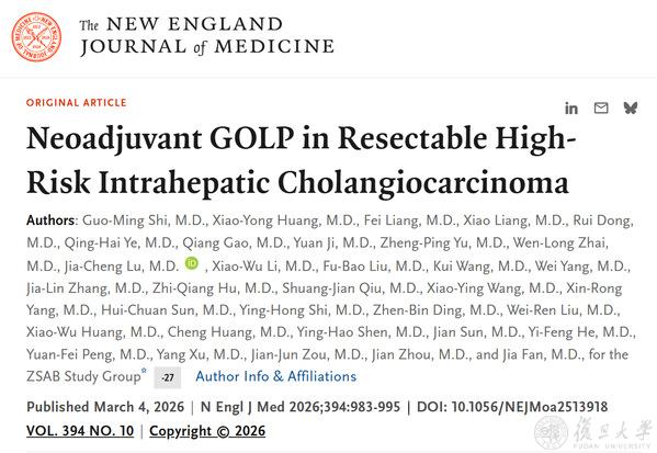 2026年3月5日,复旦大学附属中山医院樊嘉、周俭、施国明团队在《新英格兰医学杂志》(The New England Journal of Medicine)发表题为“Neoadjuvant GOLP in Resectable High-Risk Intrahepatic Cholangiocarcinoma(新辅助GOLP方案在可切除、伴高危复发肝内胆管癌研究)”的研究论文。该研究探讨了“GOLP新辅助创新方案”在高危复发肝内胆管癌治疗中的价值,为高危复发的肝内胆管癌病人带来长期生存希望。
