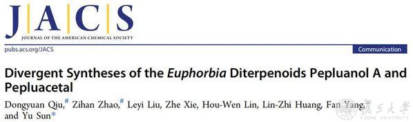 2026年3月12日,复旦大学药学院孙域课题组与上海交通大学医学院附属仁济医院杨帆合作,在《美国化学会志》(Journal of the American Chemical Society)上发表了题为“Divergent Syntheses of the Euphorbia Diterpenoids Pepluanol A and Pepluacetal”的论文,团队通过采用发散性合成策略,利用多种光化学反应,成功实现了天然产物Pepluanol A及 Pepluacetal的高效合成。并通过后续合作开展的活性研究,首次揭示了该类化合物具有抗肺纤维化活性,这为该类中药提取物的活性成分研究及其药用价值的深入挖掘创造了有利条件。