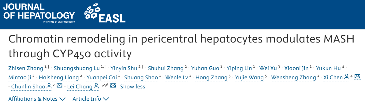 4月1日,《肝脏病学杂志》(Journal of Hepatology)在线发表了复旦大学放射医学研究所畅磊研究员、邵春林研究员与南方科技大学陈曦教授团队的合作研究成果,题为“Chromatin remodeling in pericentral hepatocytes modulates MASH through CYP450 activity”。该研究系统揭示了位于肝小叶中央静脉周围的 Lgr5⁺肝细胞中,染色质重塑因子DPF2通过调控 CYP450代谢酶活性与全反式维甲酸(atRA)平衡,进而影响放射性肝损伤、代谢相关脂肪性肝炎(MASLD)发生发展的全新机制,为 放射性肝损伤、MASLD/MASH的发病机理研究与临床干预提供了重要理论依据。