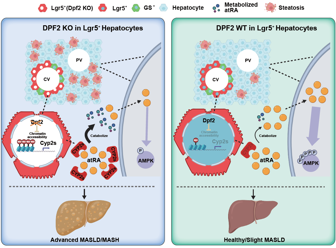 在本项研究中,团队综合运用基因工程小鼠模型、单细胞转录组、空间转录组、染色质可及性分析(ATAC-seq)以及表观遗传修饰检测(CUT&RUN、CUT&Tag)等技术,系统解析了 Lgr5⁺肝细胞中SWI/SNF染色质重塑复合物关键亚基DPF2的功能。研究发现,Lgr5⁺肝细胞中DPF2的缺失会显著提高CYP2家族代谢酶基因启动子区域的染色质可及性与激活型表观修饰,进而增强CYP2对全反式维甲酸(atRA)的分解代谢。肝脏内atRA水平下降会导致AMPK磷酸化水平降低,无法有效维持脂质代谢稳态,最终显著加剧饮食诱导的肝脏脂质沉积、炎症及脂肪性肝炎病变。同时,该研究还观察到,Lgr5⁺肝细胞DPF2敲除小鼠同样表现出明显的放射性肝损伤表型,提示这一机制在辐射损伤与代谢肝病中具有共通的重要意义。这一发现也为肝病研究提供了重要方法学启示,提示传统批量组学或全肝基因操作可能掩盖空间限制性细胞群体驱动疾病的关键机制。