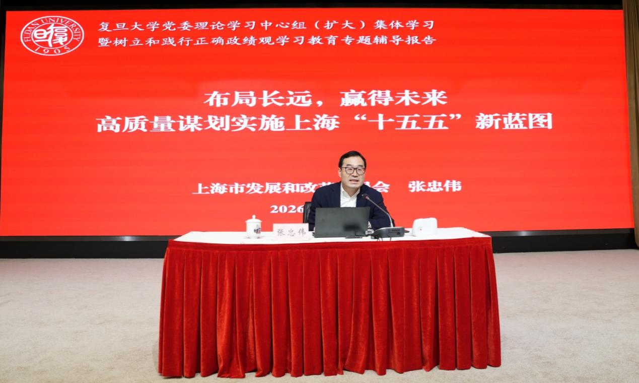 4月14日上午,复旦大学举行树立和践行正确政绩观学习教育专题辅导报告暨党委理论学习中心组(扩大)学习会。上海市发改委副主任、长三角区域合作办公室常务副主任、上海市发展改革研究院院长张忠伟作辅导报告。校党委副书记林立涛主持报告会。