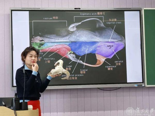 这就是《动物考古学》课程的课堂实践。董宁宁一边放映着绵羊各个方位的头部解剖图,一边单手举着真实的绵羊头骨,为同学们介绍其形态特征。为了让知识更形象,她时不时指着自己的面部,将动物头骨与人类头骨的部位相对照着讲解。