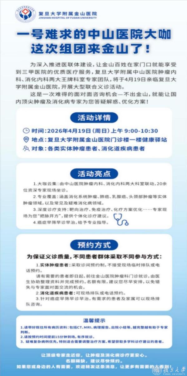 全国肿瘤防治宣传周期间,金山医院紧扣“早筛早诊早治”主题,将于4月19日牵头联合医联体单位中山医院、金山卫镇社区卫生服务中心,在金山医院门诊健康驿站开展大型联合义诊及党建活动。