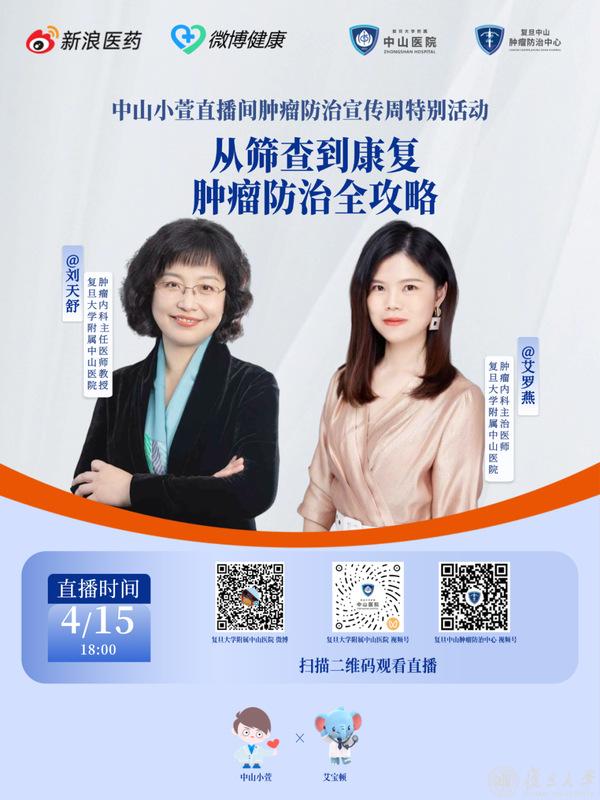 4月15日—21日是第32个全国肿瘤防治宣传周。复旦上医各附属医院紧扣“早防早筛早治 同心携手抗癌”主题,立体化传播普及肿瘤防治知识,面向不同人群开展精准宣教,推动防治关口前移,倡导健康生活方式,引导高危人群主动筛查、患者规范诊疗,联动多方资源凝聚抗癌合力,助力构建全周期健康防护体系。