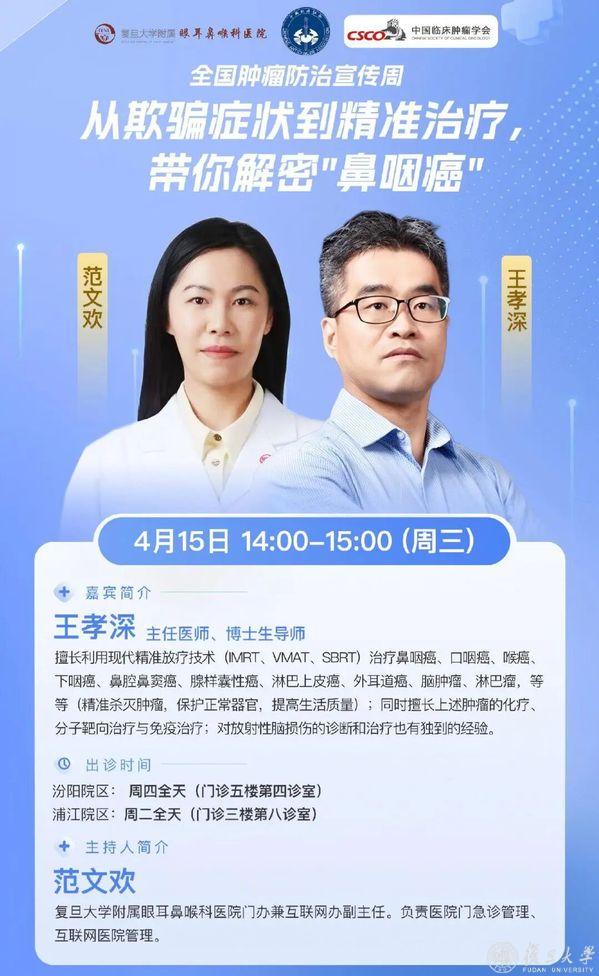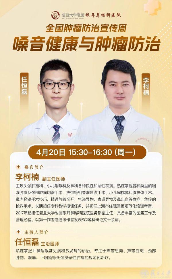 4月15日,放疗科主任医师王孝深开讲鼻咽癌科普,针对该病早期症状不典型、易延误诊治的特点,结合理论与临床案例,讲解早期诊断、规范治疗及放疗设备选择,破除认知误区。4月17日、20日,眼科主任医师张锐、耳鼻喉科副主任医师李柯楠与主治医师任恒磊,将分别围绕眼睑肿物、嗓音健康及肿瘤防治等内容开展科普,用通俗易懂的语言拆解疾病诱因、早期信号及筛查要点以及日常防护、规范诊治的核心知识,引导大家关注眼耳鼻喉部位的细微异常,树立“早发现、早诊断、早治疗”的防癌理念。