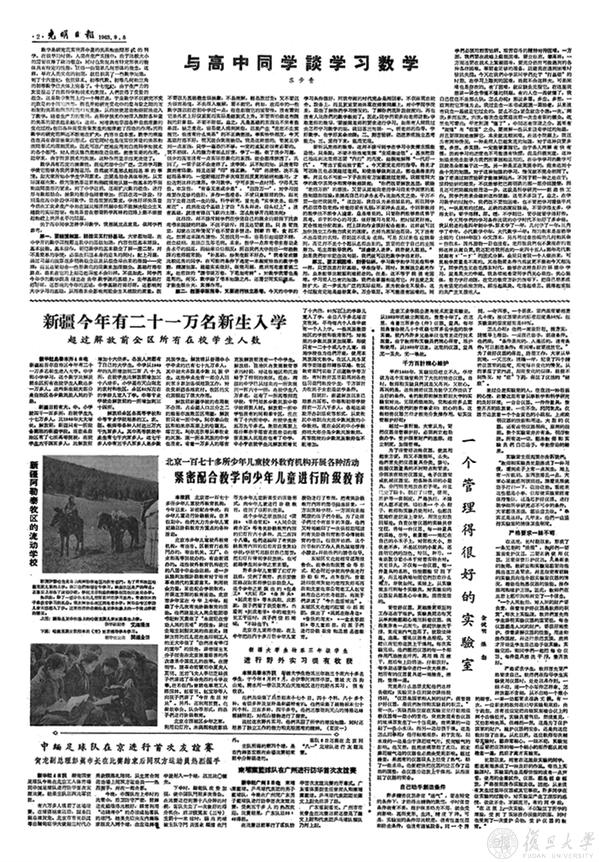事实上,1953年苏步青已与光明日报结缘。那年的6月9日,《光明日报》刊登了时任上海复旦大学教务长苏步青的文章《介绍勃立瓦洛夫著“解析几何学”》,这是他作为作者首次在这张报纸亮相。此后几十年间,他在《光明日报》上发表文章20多篇,既有对数学问题的探讨,也有对治学为人的感悟,更有不少抒怀言志的诗作。其中,尤以对青年学子学习态度、治学方法、求学志向的关心指导为多。