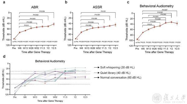 团队还首次锁定三大影响疗效的关键因素,为精准施治提供科学依据。一是年龄,0.5至3岁低龄患儿治疗有效率达100%,未成年患者获益更显著;二是畸变产物耳声发射(DPOAE),作为评估耳蜗外毛细胞功能的重要指标,给药前在更多频率引出DPOAE反应的患者,治疗后听力恢复效果更好;三是基因突变类型,它会影响行为学测听阈值的恢复程度,但不影响治疗是否有效。相关发现为临床选择合适患者、制定个性化方案提供了依据。