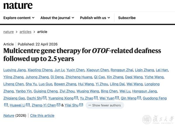 北京时间4月22日晚,复旦大学附属眼耳鼻喉科医院舒易来教授领衔的先天性耳聋基因治疗多中心临床研究在《自然》(Nature)杂志在线发表。