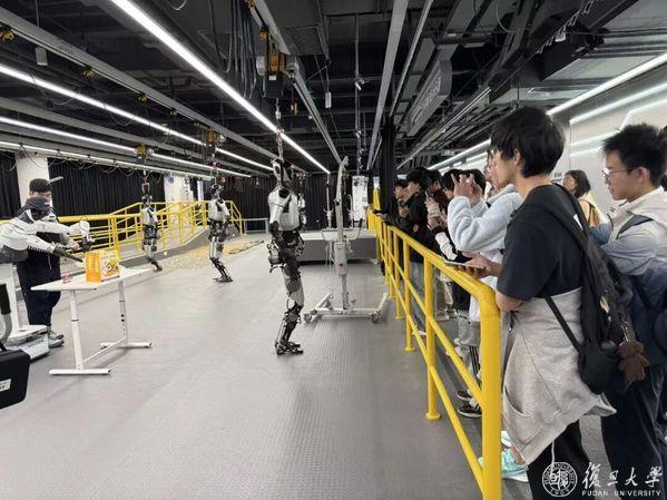“老师,人机协作真能替代人工完成精密操作吗?”“机器人的步态控制怎么适应不同路面?”带着教室内没解开的疑问,智能机器人与先进制造创新学院的王岚鑫和同学们,走进了人形机器人(上海)有限公司的生产车间。一台银色人形机器人挥手致意,精准完成抓取、堆叠动作,更在工作人员设置的障碍物前灵活转身。“它的关节转动和我们的手臂一模一样,在扭转角度上甚至超过了人类极限。”王岚鑫忍不住掏出手机记录,并追问工程师:“刚才那个动态抓取,是不是用到了我们学的阻抗控制算法?”除了一个个“各显神通”的机器人,同学们还近距离接触了复旦“光华一号”原型机,对具身智能与控制算法的实际应用有了更具象的理解。