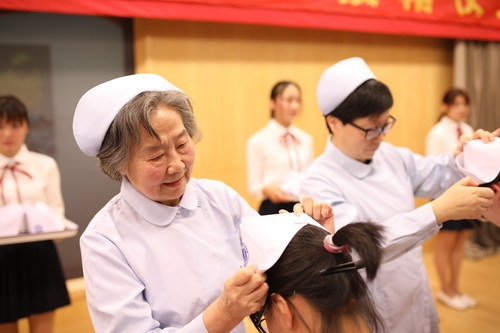 2017年国际护士节前夕,护理学院授帽仪式举行。护理学院首任院长杨英华、各附属医院护理部主任代表、护