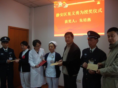 12月19日下午,华山医院急诊科护士朱培燕、保安程道宏和王德贵3名同志被授予静安区见义勇为先进分子荣