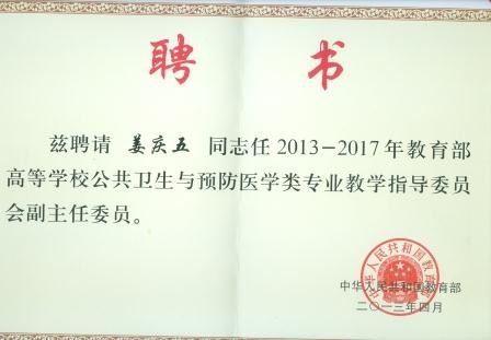 据悉,国家教育部近日发布聘书,聘任我院姜庆五教授为2013-2017年教育部高等学校公共卫生与预防医