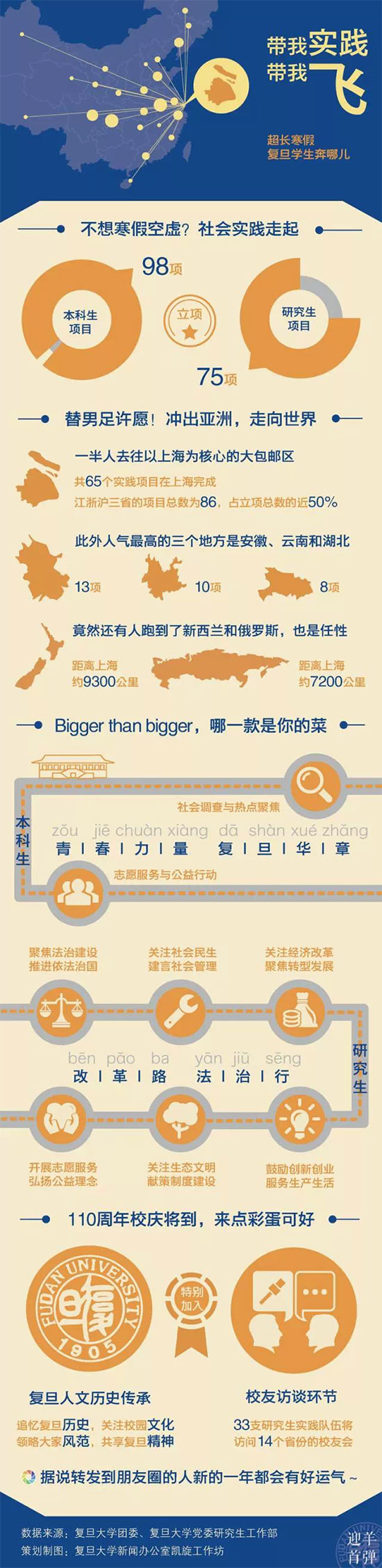 (制图 钟凯旋)超长寒假怎么过?对于上千名复旦学生来说,他们选择去看看外面的世界,以支教、调研等形式
