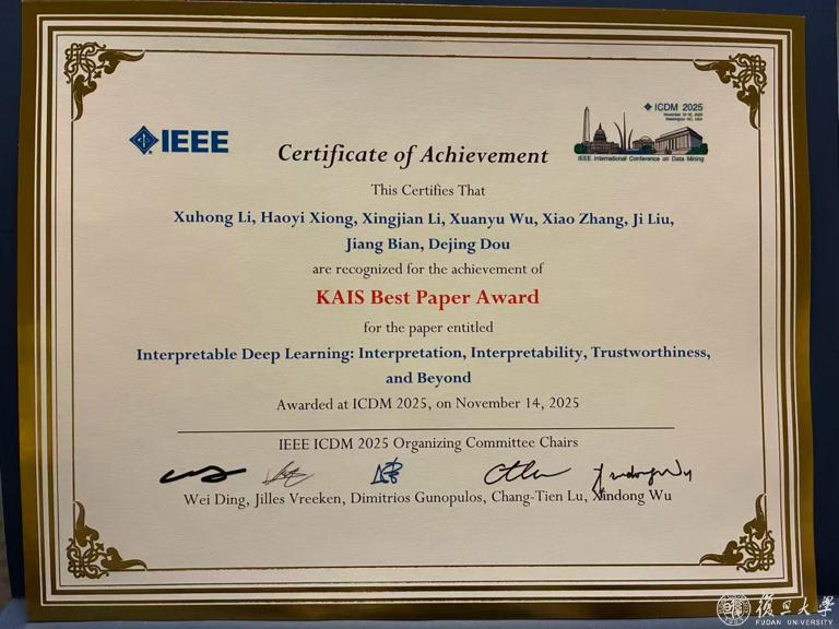计算与智能创新学院窦德景教授团队荣获2025 KAIS最佳论文奖