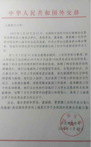 复旦大学国务学院亚信峰会志愿者获外交部表扬