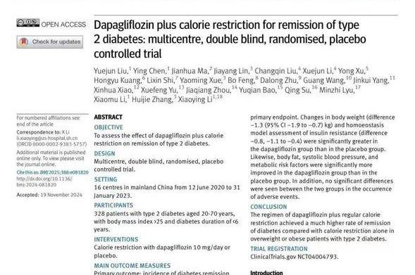 部分2型糖尿病患者药物缓解坚持运动饮食后后可停药逆转。2025年1月22日,复旦大学附属中山医院内分泌科李小英、李晓牧教授团队联合南...
